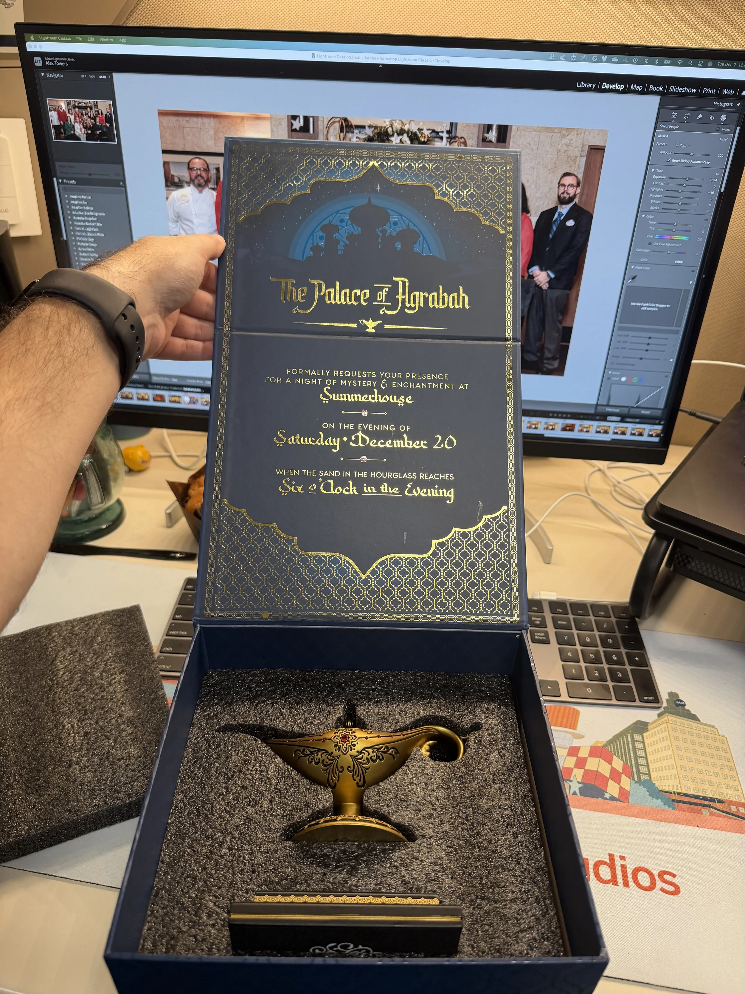 Holiday Party Gift-vitation (Created the artwork, die lines, chose finishes (foil, soft touch flood, and spot gloss)
